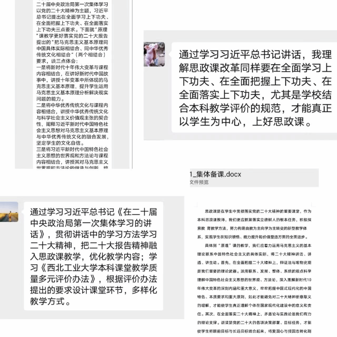 马克思主义基本原理系备课活动采取“自主学习+书面呈现”的方式开展。各位老师重点学习了习近平总书记在二十届中央政治局第一次集体学习时的讲话,以及《西北工业大学本科课堂教学质量多元评价办法》,更加清楚了如何更好开展思政课教学质量评价等问题。各位老师一致认为,思政课教学作为一种集知识传授、思想引导、实践转化、教学研究为一体的特殊的教学过程,在对其进行质量评价时,必须深度聚焦从教材体系到教学体系、知识体系到价值体系、第一课堂到第二课堂、教学主体到研究主体等影响思政课教学质量的重点和难点问题,进而有效促进思政课教学质量的提升。