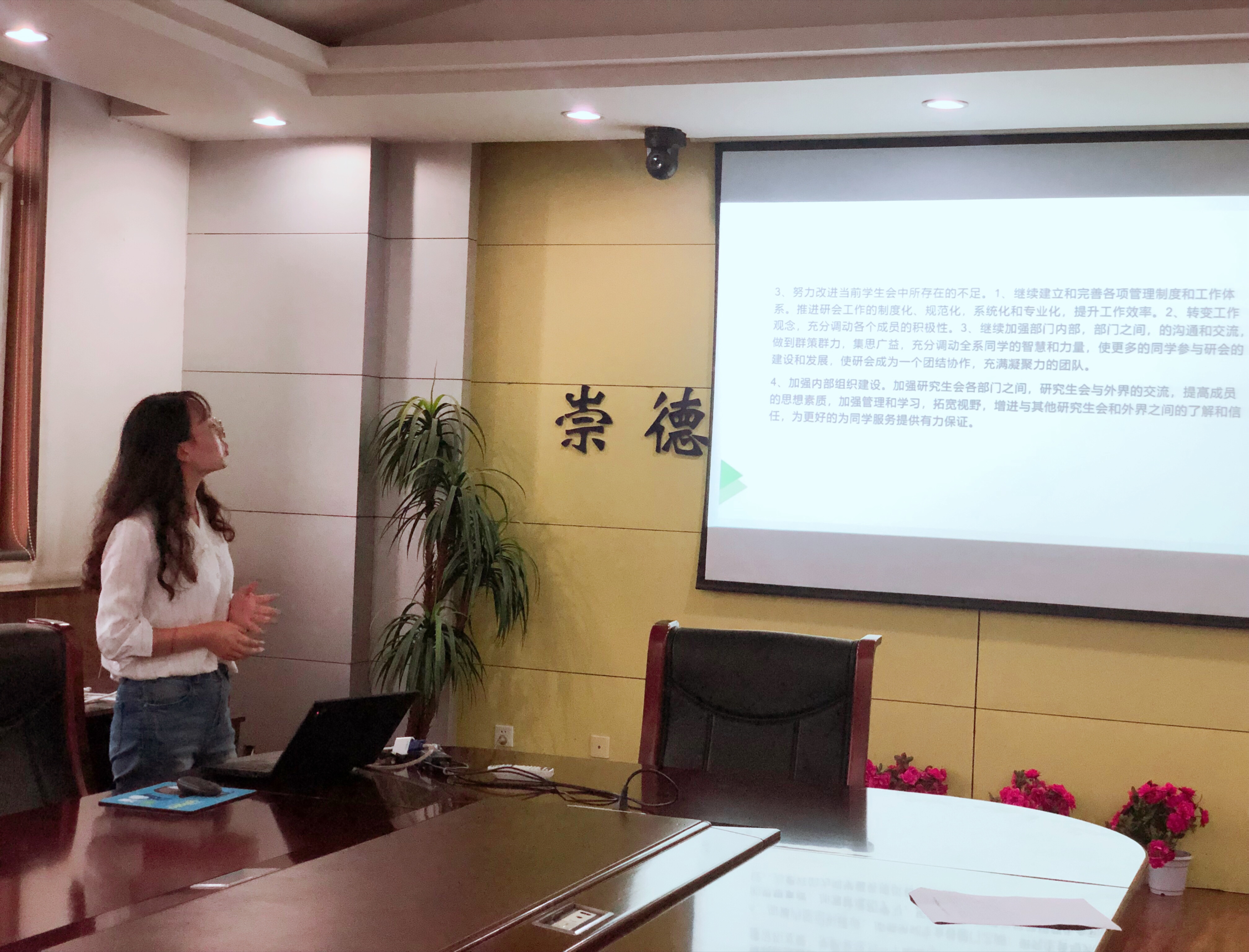 任静从她参与的往期活动、工作计划和竞选目的三方面进行答辩。她总结了前期参加的主题团日活动和社会实践活动,在之后的工作规划中她提出要加强团队内部组织建设、继承弘扬研究生会的优良传统以及改进当前工作中的不足。