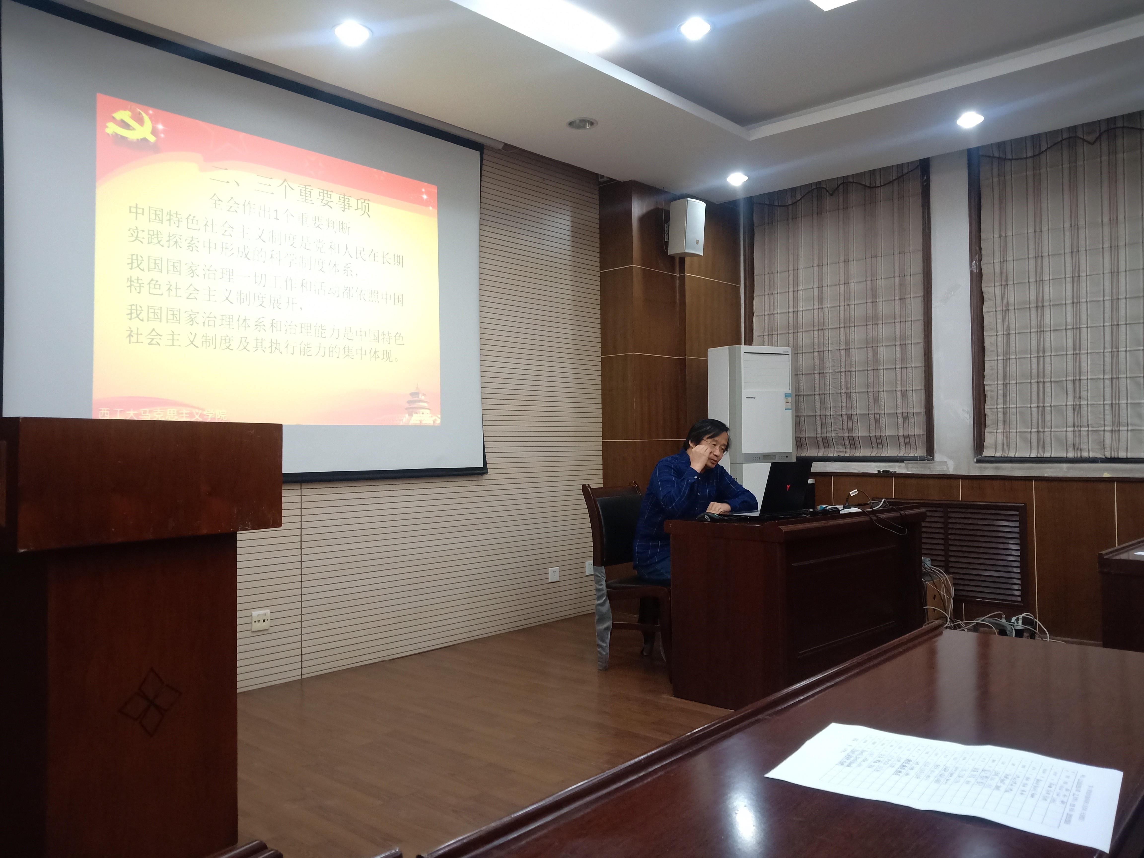 高宝营副教授以十九届四中全会为主要内容。首先,以十九届四中全会的总体情况为切入点,包括参会人员、会议时间、地点和概况,让同志们对十九届四中全会做初步了解,为深入学习十九届四中全会精神打下基础。其次,高老师依次讲解了十九届四中全会三个重要事项、我国国家制度和国家治理体系的十三个显著优势,坚持和完善中国特色社会主义制度、推进国家治理体系和治理能力现代化的总体目标和和具体路径,并结合现实,以中国的港珠澳大桥、天眼、大兴机场、“少年班”等具体事例来进行分析,使大家对十九届四中全会精神有了深入的理解。最后,高宝莹副教授以十九届四中全会中关键词的新提法、新理解做深入解读,让同志们收获颇丰。