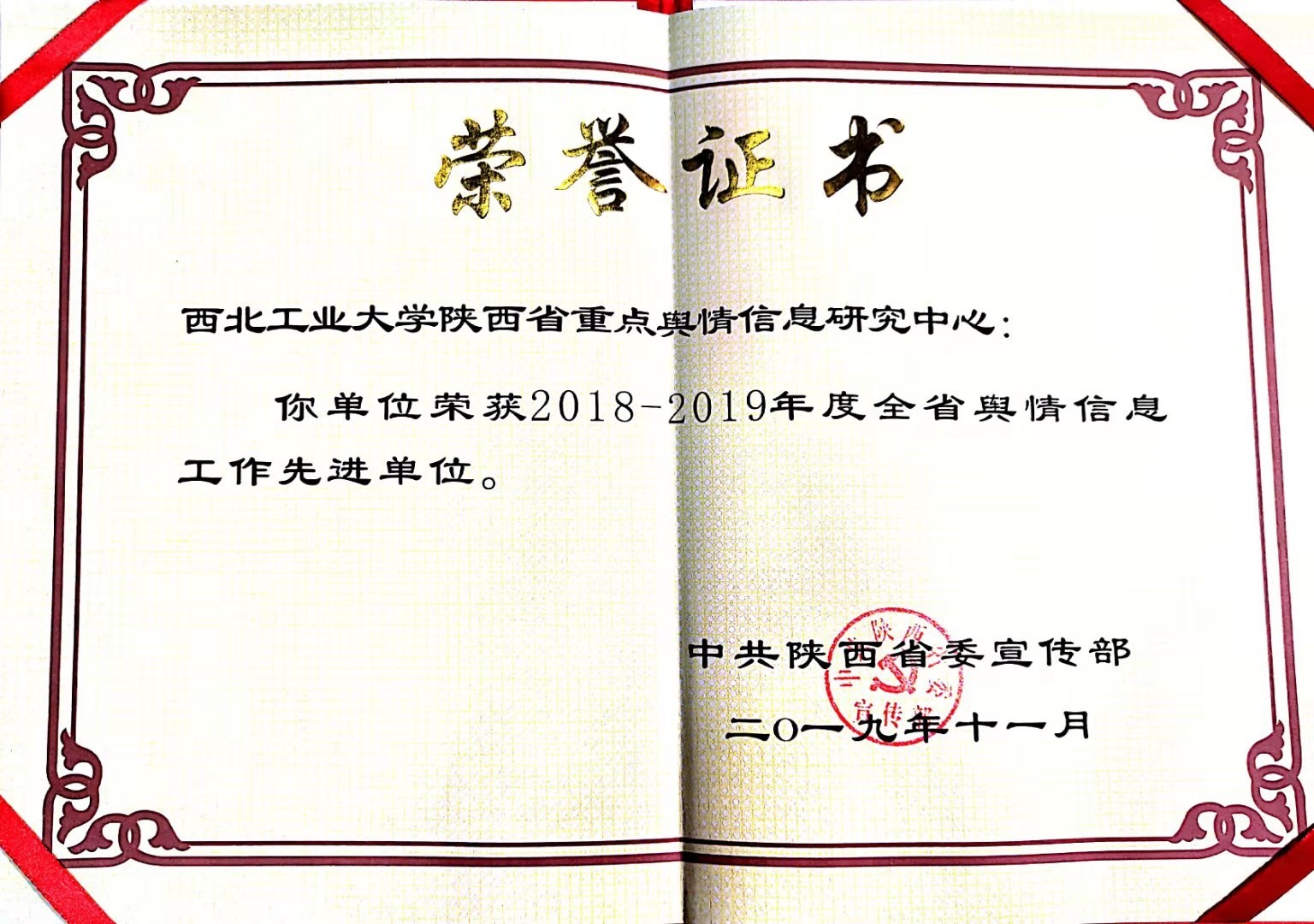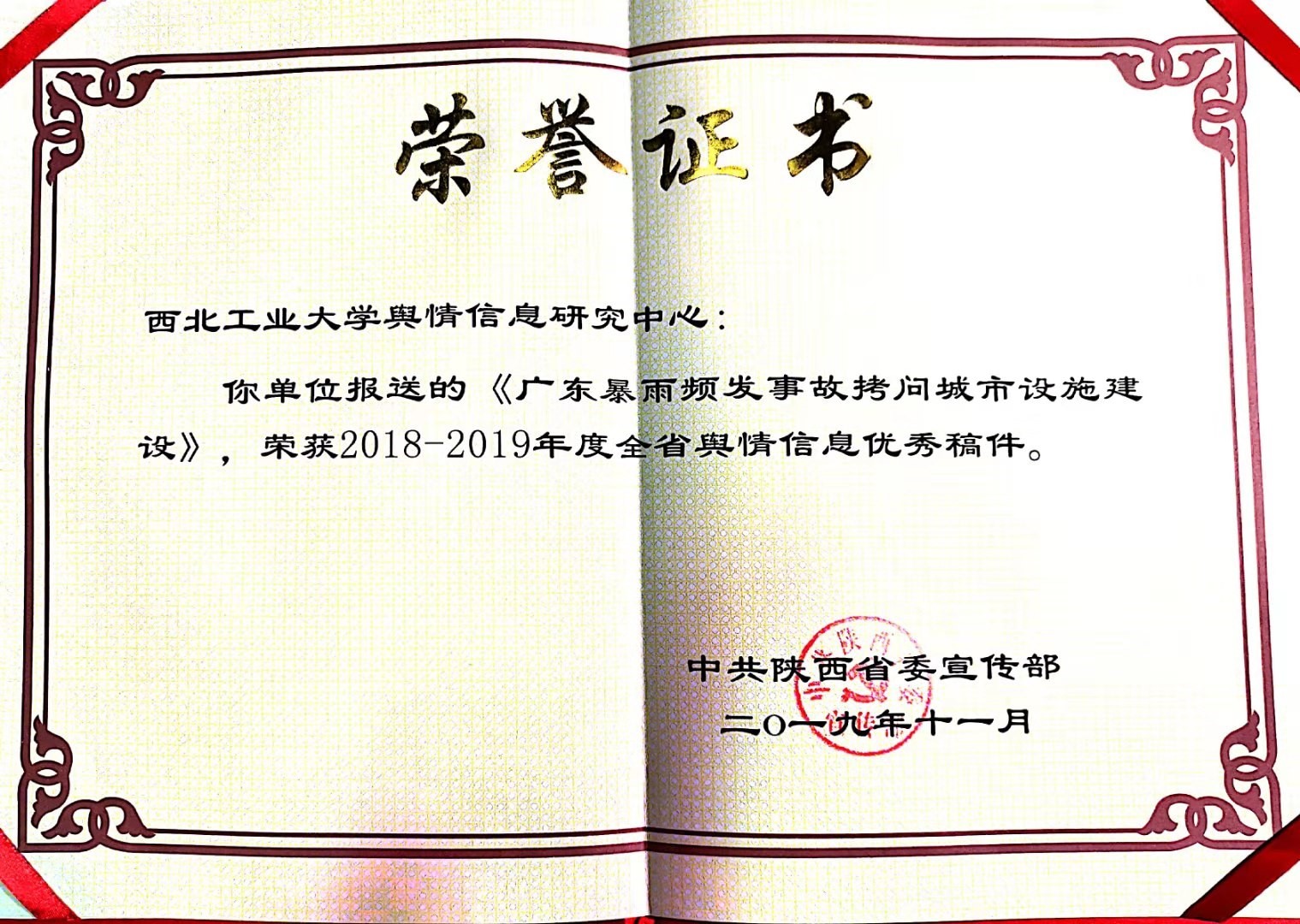 舆情工作表现突出,获得多项荣誉。西北工业大学陕西省重点舆情信息研究中心被评为2018-2019年度全省舆情信息工作先进单位、中心副主任贺苗被评为省级先进个人,她撰写的舆情稿件《广东暴雨频发事故拷问城市设施建设》被评为优秀稿件(全省共30篇),并代表中心进行《着力“四个到位”模式 凝聚舆情工作共识》的主题发言。