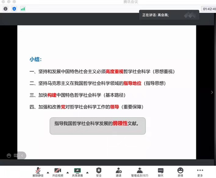 习近平新时代中国特色社会主义思想学习读书会自成立以来越来越受到老师同学欢迎热爱,本次活动更是创下自举办以来的参与人数新高,相信未来还会有越来越多的老师和同学加入。两位老师希望借助本次读书会这个契机,让同学们在阅读中思考,在交流中进步,助力我国哲学社会科学的进步发展,让更多的青年大学生用习近平新时代中国特色社会主义思想武装头脑、指导行动,争取早日实现中华民族伟大复兴。