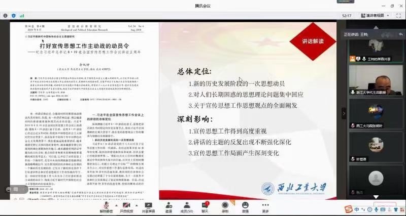 之后,代玉启老师和鲁杰老师对两位导读人进行了点评,充分肯定了同学们丰富的内容展示和精彩的发言。两位老师与同学们开始进行自由交流,代玉启老师谈到,此次讲话回顾了十八大以来我党在宣传工作上所取得的成就,其中“九个坚持”就是尤为重要的底线思维,并且代玉启老师还与参会师生分享了自己经验,阅读分析文献的方法,指出在阅读文献时最好可以找到纸质版资料会更有助于挖掘知识,学习到文献中更详细深层次的内容,让全体参会师生耳目一新,获益匪浅。同时鲁杰老师谈到,同学们在分析阅读文献时不能仅停留在梳理层面,一定要多提出自己的思考,同时可通过结合十九届五中全会的内容去学习此次讲话内容与精神。此时读书会活动搭建了良好平台,同学们纷纷与两位老师交流读书心得或者提出相关问题。例如,博士生周湘鄂同学向两位老师提出如何分析得出思想政治教育的话语权问题。博士生艾强同学提出了如何看待意识形态与文化的关系,以及文化自信视阈下如何更好建设社会主义意识形态的相关问题。