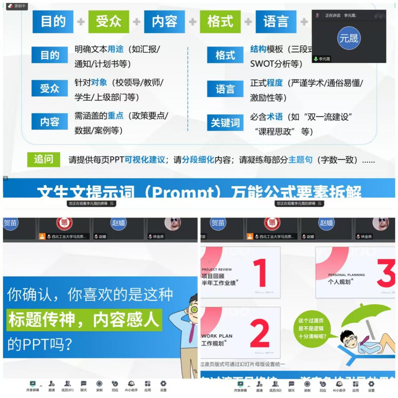李元晟主任围绕“AI赋能:高表现力工作型PPT怎么做”的主题,以风趣幽默的形式分享PPT的制作及美化技巧,详细介绍和分析各类AI软件的功能及优劣,通过非常丰富的实例操作讲解AI生成文稿、图片、PPT、视频的具体使用方法,充分展现了AI技术的多种用途和赋能课程带来的效率跃升,全景体现了AI技术与教学工作融合的重要性。