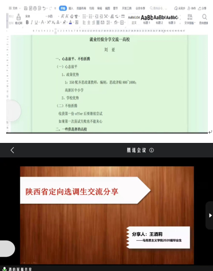 大学的房琳薇和在本校硕博连读的的刘凯强讲述了备考经验和硕博连读的感受,鼓励大家在毕业季要及时调整心态,积极面对考核、复试等环节。随后,签约高等院校的两位毕业生为想要求职高校的同学提供了宝贵的经验参考。刘亚和王培琳介绍了马克思主义理论专业就业的政策优势,并从高校选择、面试流程及备考建议等方面进行分享。紧接着,就职于国有企业的韩沛雨从求职经历、面试过程和工作日常等方面介绍自身的就业经验。之后,董咪咪和王酒莉分享了选调生的备考过程、考试形式、学习经验以及工作感受。整个活动持续了近三个小时,参会同学纷纷表示收获颇丰,并对学长学姐的无私分享表示感谢。