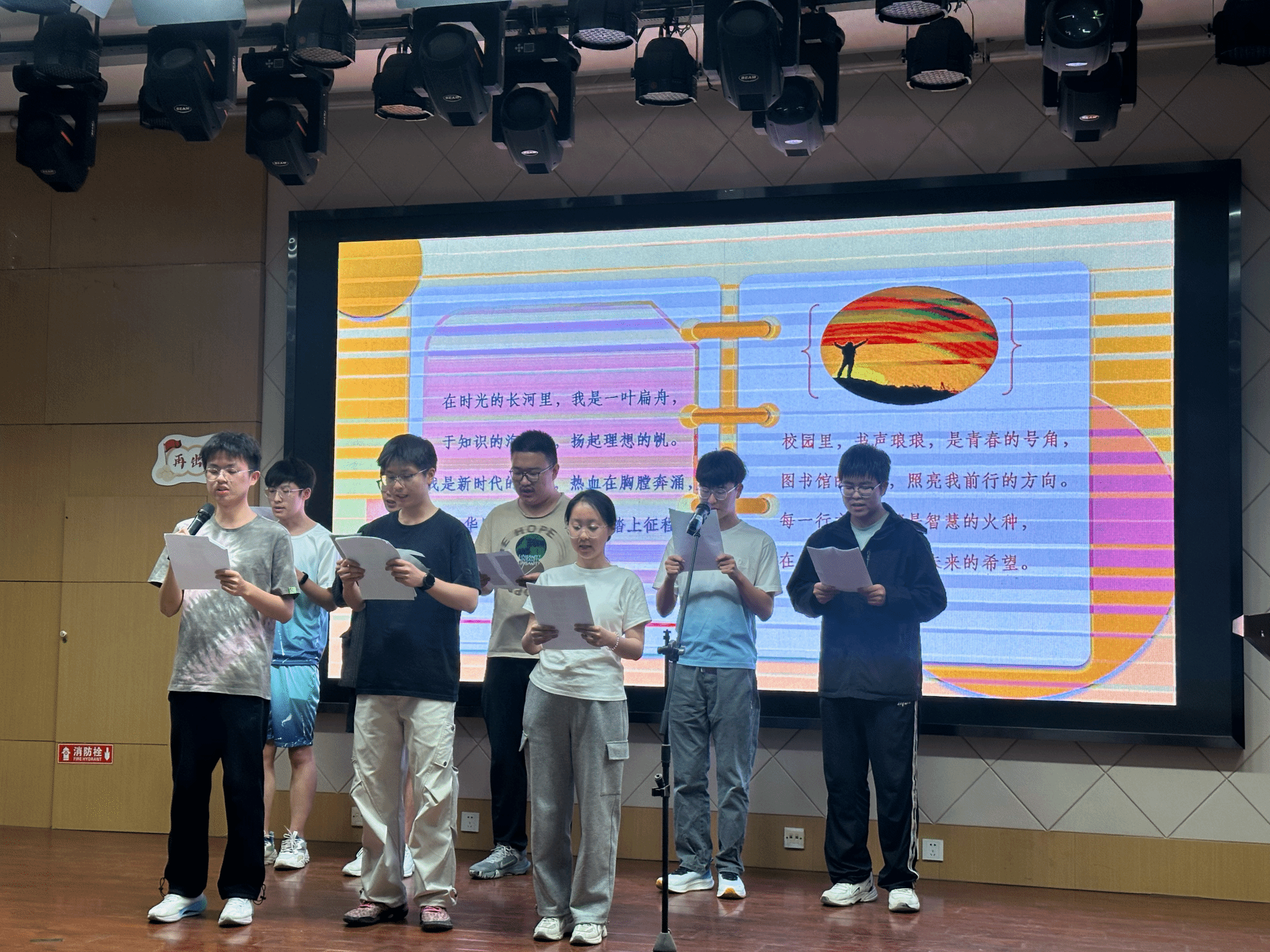 本次评审机制突破常规:除专业教师评审外,特别从35支参赛团队中随机抽取10名学生组成大众评审团,实现评审视角的多元互补,彰显赛事公正性与学生主体性。最终,第12组以整齐的着装、恰当的视频背景烘托、传神地表演,赢得了台下最热烈的掌声,摘得桂冠;13组以流畅的背景画面与音乐,配合声情并茂的朗诵、沉郁顿挫的吟诵斩获二等奖;16组凭借深情演绎了中华民族的百年历程与浴火新生的历程,放声歌唱了新时代青年学子投身科技的壮志,以对诗歌内容的深刻理解与表达获得三等奖。
