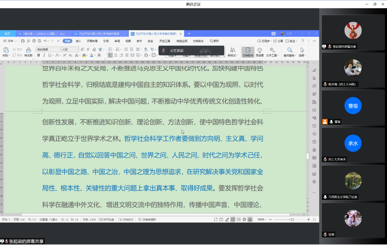 在在线课程建设、教材建设等方面的相关政策支持,提出要结合西工大元素,建立更多新形态课程和新形态教材;王彦丽系主任认为思政课现在拥有一个良好的良好环境,思政课教师要有巨大的使命感和责任感。其他党员同志都从不同角度、不同层面分享了自己对此次重要讲话精神的学习感悟,交流了关于思政课改革创新的意见,畅谈了思政课教师发展的相关建议。