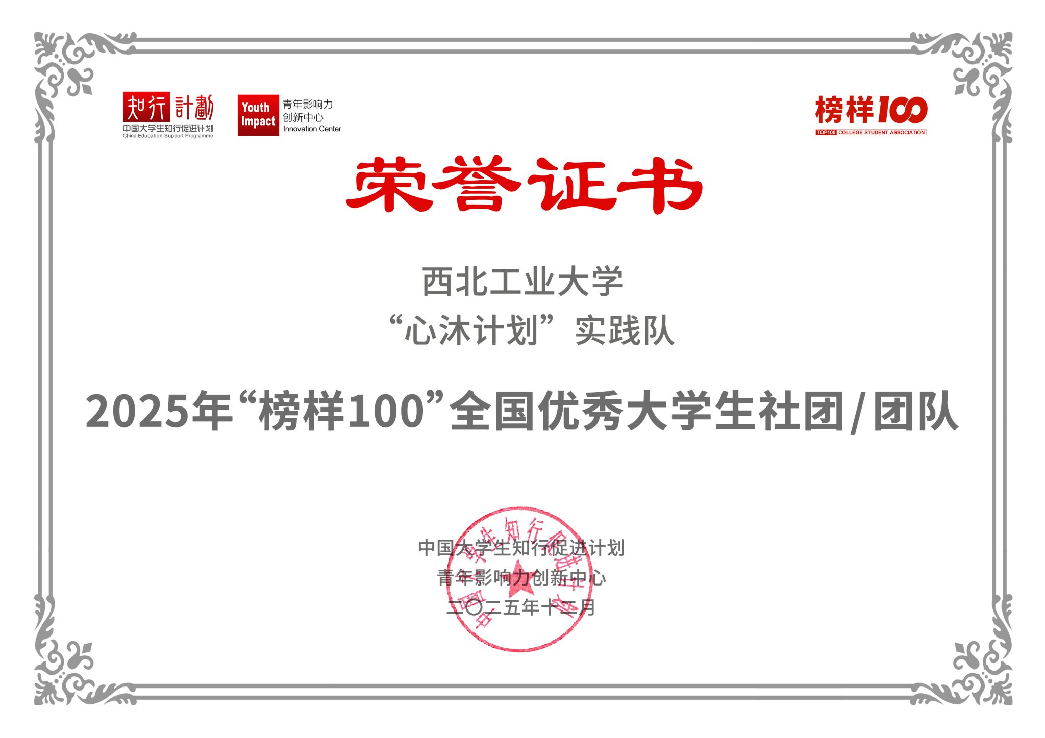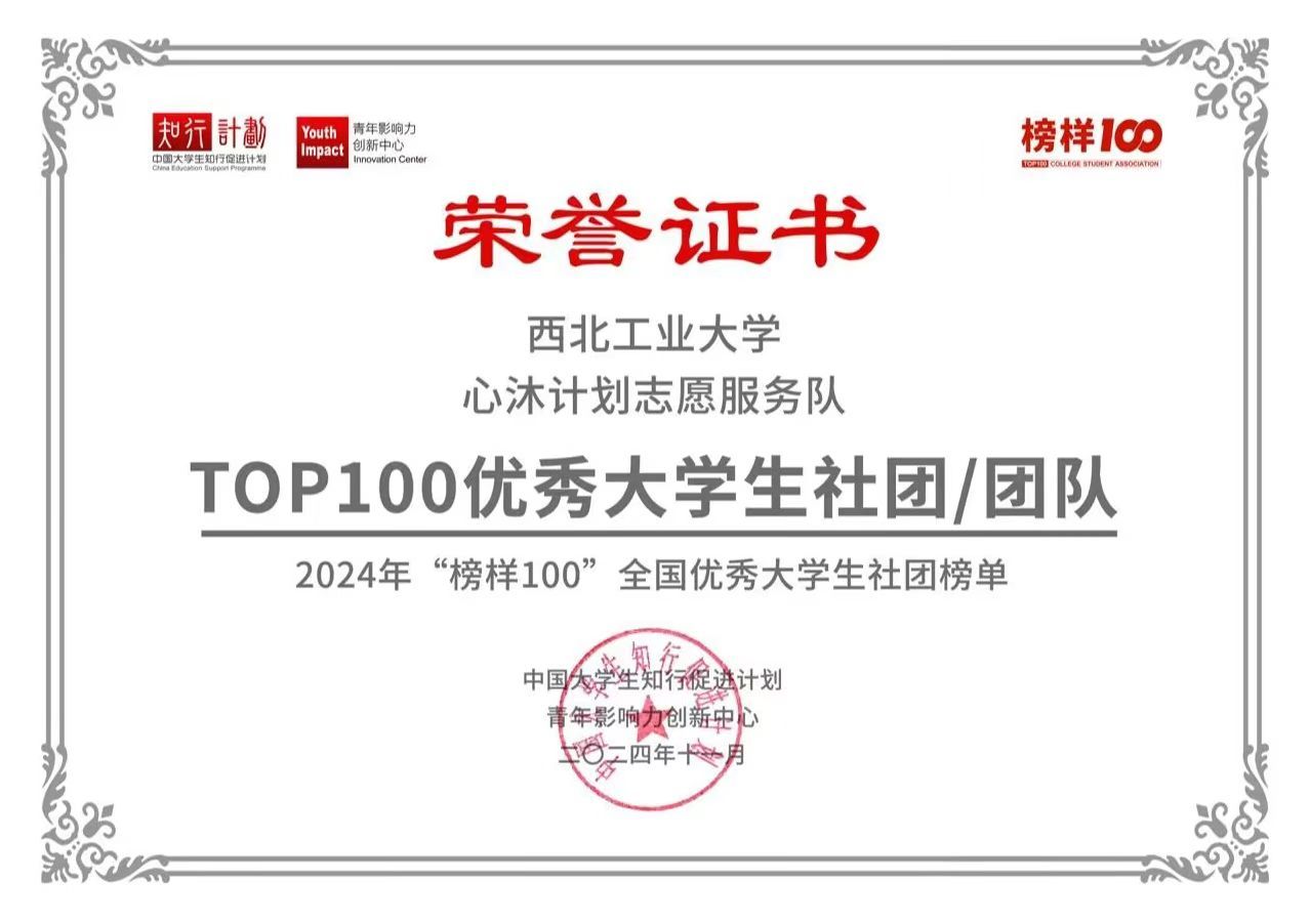 近日,2025“榜样100”大学生社团优秀案例征集活动结果公布,西北工业大学“心沐计划”实践队在全国大学生社团和团队中脱颖而出,成功入选首批榜单,再度荣获“‘榜样100’全国优秀大学生社团/团队”称号。