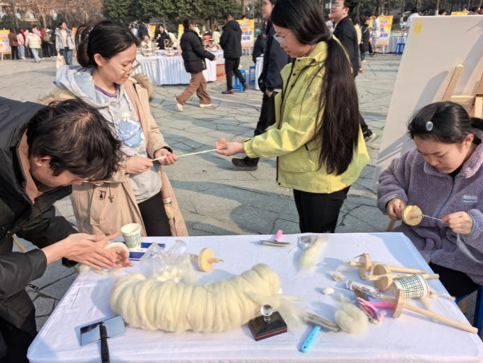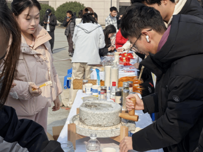 在活动现场,纺棉线摊位暖意融融,一根根洁白的棉絮在学生指尖捻转、拉伸,从蓬松的棉团变成纤细坚韧的棉线;在推石磨区域,学生们先添豆、再推磨,沉甸甸的石磨在合力推动下缓缓转动,乳白色的豆浆顺着石磨边缘缓缓流淌。