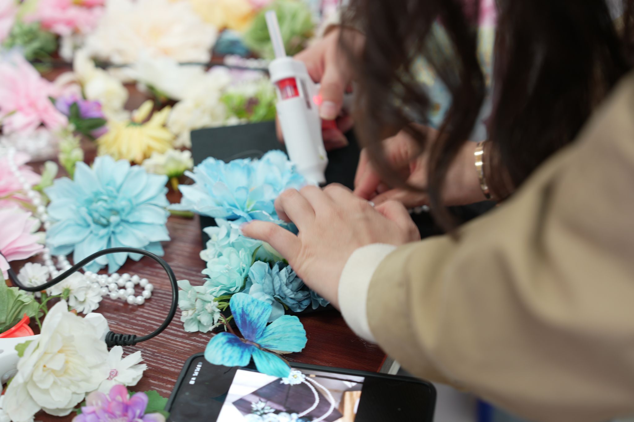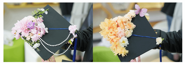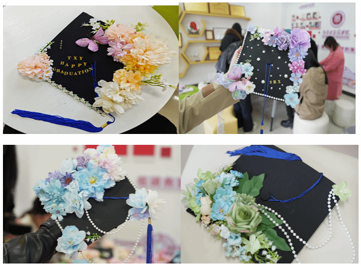 精心准备了仿真花簇、珍珠串、字母贴、流苏、蕾丝花边等全套DIY材料,品类丰富、色彩多样,为同学们的创意发挥提供了充足保障。大家围坐长桌,或俯身专注用胶枪粘贴花饰,或交流设计思路、相互协作调整布局,指尖流转间,将校园时光与青春心愿融入每一处细节。有的同学以暖橙牡丹与粉紫小花铺陈帽檐,搭配精巧蝴蝶装饰,尽显温婉雅致;有的以浅蓝绣球与珍珠串珠勾勒轮廓,缀以镭射蝴蝶结,兼具优雅与个性;还有的用金色字母贴镌刻专属名字缩写,让学士帽成为独一无二的青春信物。