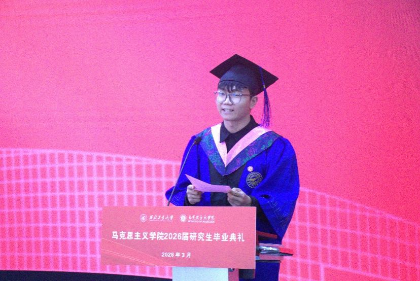 典礼现场,硕士优秀毕业生代表陈宗超、博士优秀毕业生代表石映昕依次发言,结合自身求学经历、学术成长与生活感悟,分享校园收获与毕业期许。
