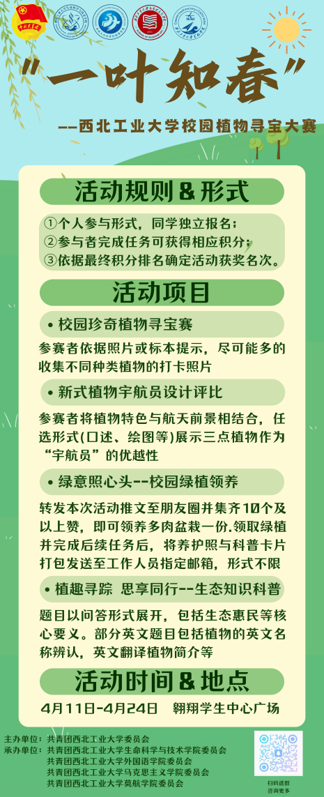 春日正好,草木向阳,不妨暂时放下忙碌的学业,走进校园,与草木对话,与春天同行。期待每一位热爱自然的学子,都能在本次活动中,寻得春日美好,解锁自然与知识的双重乐趣!