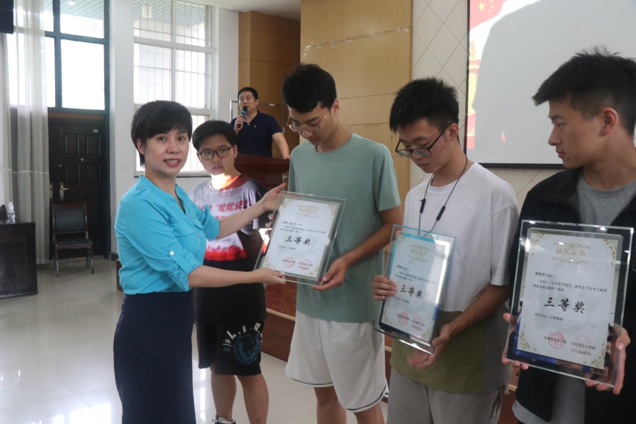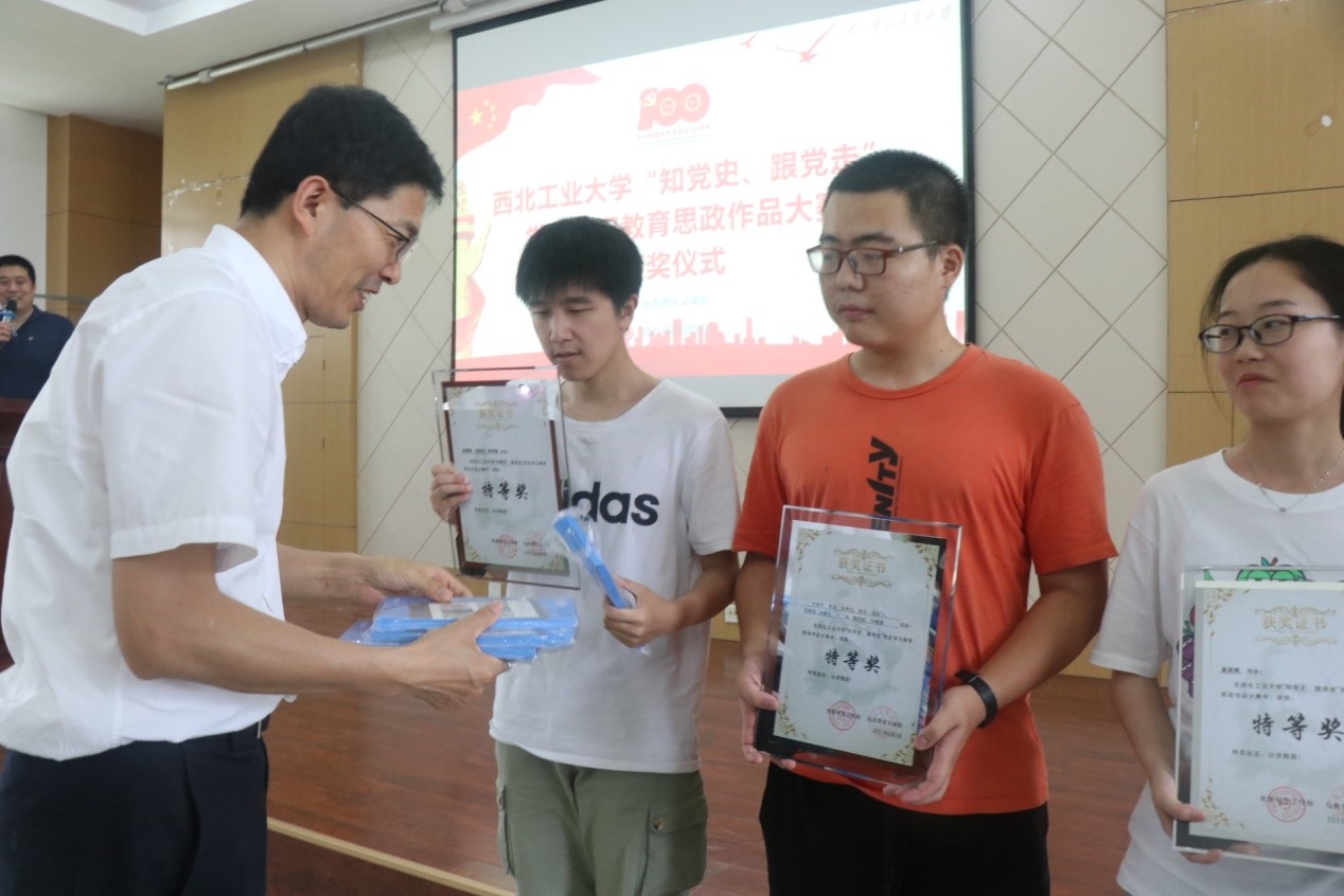 首先,李刚老师对获奖的同学们表示祝贺,对各位老师的到来表示感谢。随后,颁奖仪式正式开始,在坚定有力的《钢铁洪流进行曲》中,山磊老师、贺苗老师为获得三等奖的同学颁奖;张云龙老师为获得二等奖的同学颁奖;吴闻川老师为获得一等奖的同学颁奖;代富平老师为获得特等奖的同学颁奖。本次大赛奖品丰厚,由全校马院思政课教师组织各班同学参与,以讲好党的百年故事为主题制作思政作品,同学们积极报名,踊跃参加,自6月7日起,在电玩城游戏
