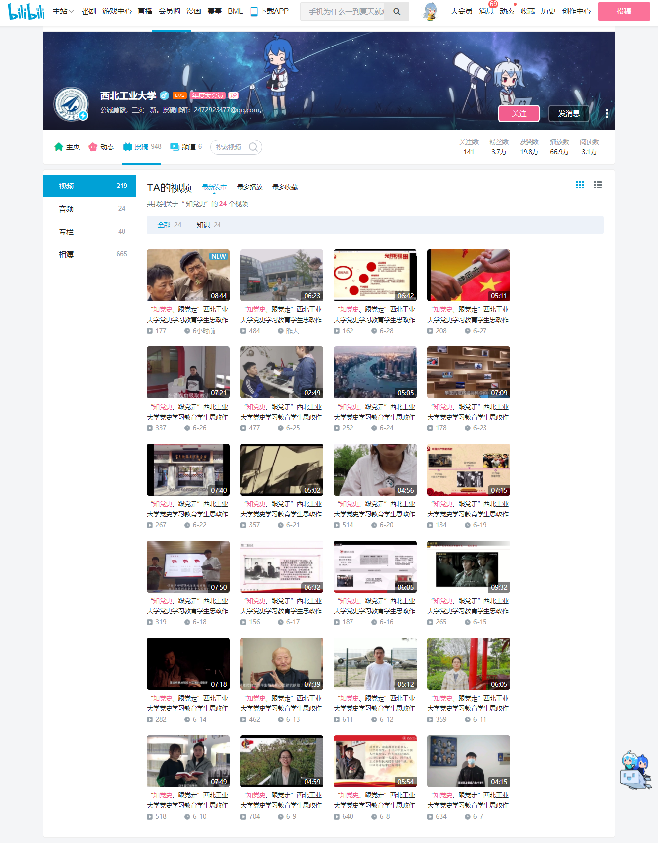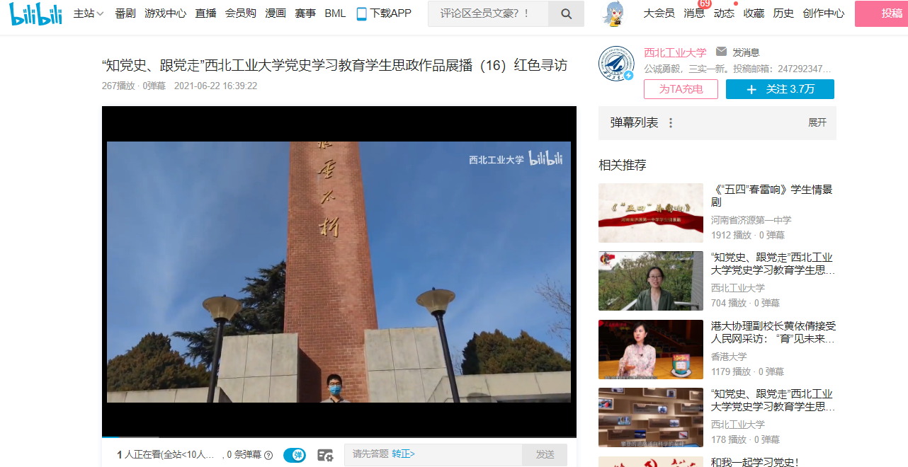 本学期,电玩城游戏 举行了“知党史、跟党走”党史学习教育思政作品大赛,经过评比,选出了100个优秀视频并举行颁奖仪式。自6月7日起,优秀作品在西北工业大学bilibili官方平台展播,至今已有数十个作品在b站与大众见面,这些作品或形式新颖,或史实扎实,或真情流露,都是工大学子用自己的方式向中国共产党成立100周年献礼。