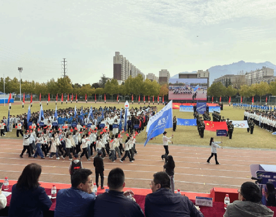 运动员方队朝气蓬勃、身姿挺拔,高举五星红旗,迈着强劲有力的步伐从主席台前经过,“马院启航,青春激扬!团结奋进,永创辉煌!”嘹亮口号谱写着独特的秋日颂歌,响彻云霄。