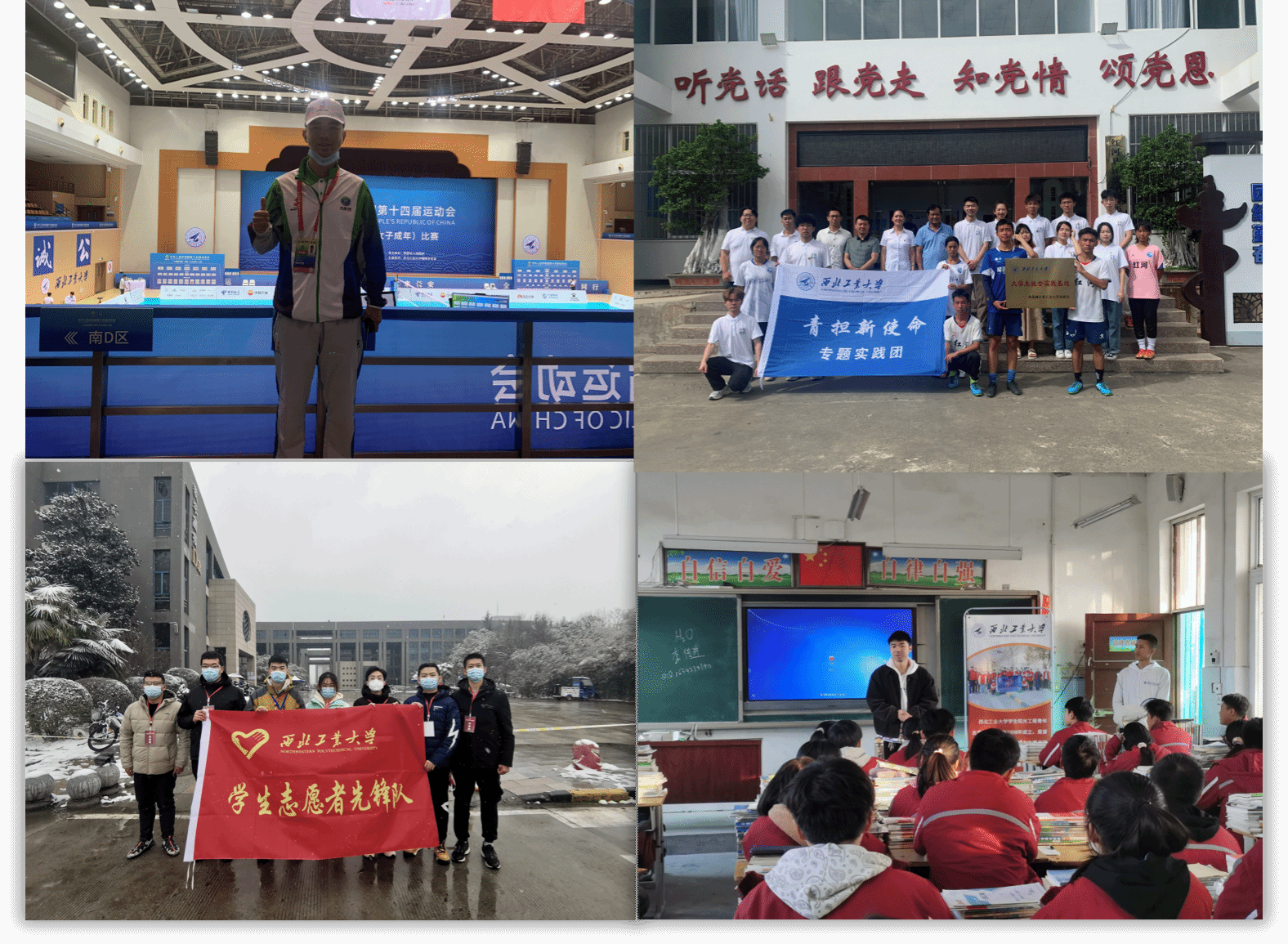 他踊跃投身各类社会实践与志愿服务,累计服务时长达1051小时。在十四运会和残特奥会赛事期间,报名成为“小秦宝”志愿者,负责观众进出场流线图设计和现场座席服务工作,累计服务2000余人次。在疫情防控期间,他身披防护服上阵一线,协助完成电玩城游戏 28轮次全员核酸采样,组织学生党团干部、退伍大学生成立电玩城游戏 研考专项服务队,承担研考期间物资转运与考务保障。在学生离校返乡之际,他主动请缨驻守机场站点,护送2824名在校生分乘38架次航班平安返乡。寒暑假期间,他下沉乡镇基层岗位锻炼,带领社会实践队前往云南红河、广西融水、宁夏盐池、陕西三原等地开展推普助力、义务支教活动。