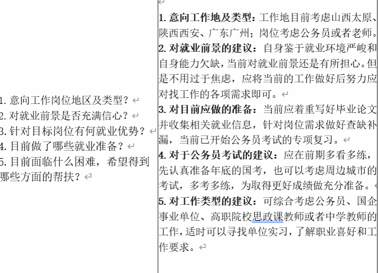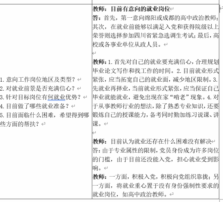 领导+研究生导师+研究生辅导员”三级联动促就业机制,积极探索育人、服务、指导、统计工作一体化建设,切实做到“一人一档”“一人一策”动态化管理。本月中旬,开展了2024届毕业生精准帮扶台账第一轮记录,采取毕业生和帮扶教师谈话形式,内容涉及“意向工作岗位及类型”、“对就业前景是否充满信心”、“针对目标岗位有何就业优势”、“目前做了哪些准备工作”、“目前面临什么困难,希望得到哪些方面的帮扶”等五个方面,学生们感悟颇多,对当前就业形式、个人职业规划、求职技能提升等都有了全面的了解,开启了个人求职就业的第一站,本次帮扶工作做到了有重点、有特点、有节点。