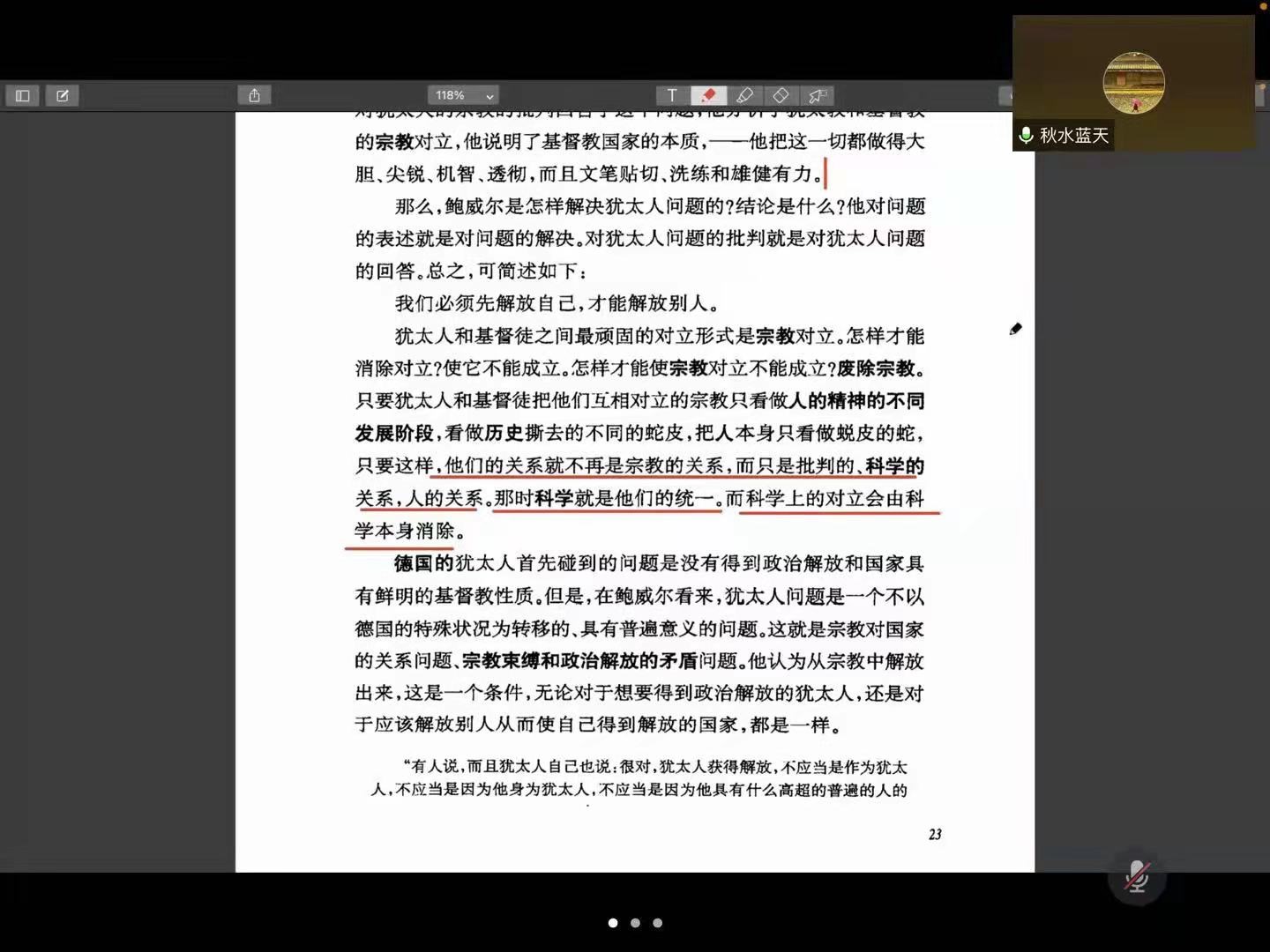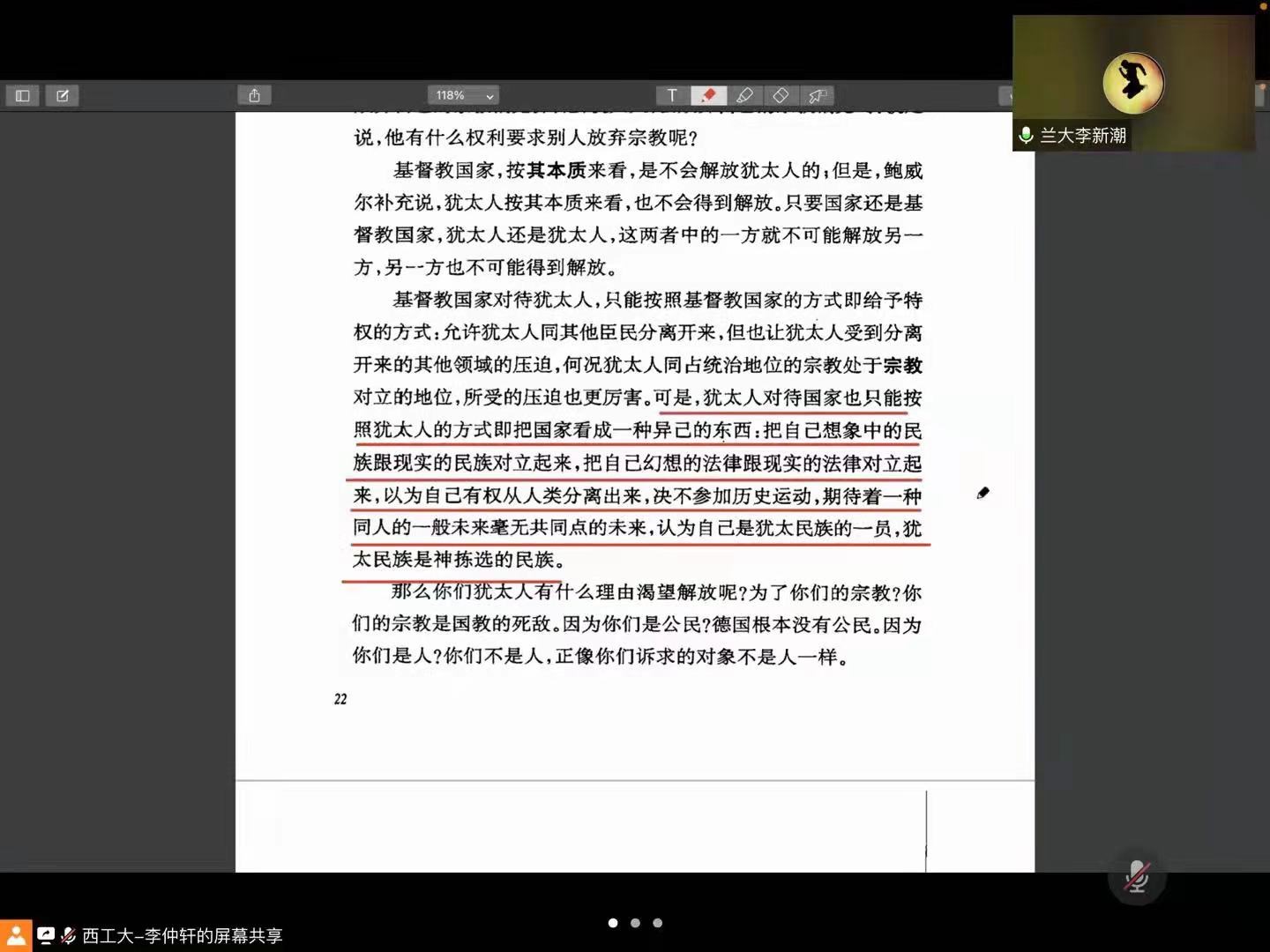助理教授张起梁主持,西工大马院张云龙老师、曹瑜老师、兰州大学青年教师李新潮坐客云端与硕博同学一起阅读马克思和恩格斯的经典著作,本次读书会的阅读内容为《论犹太人问题》。