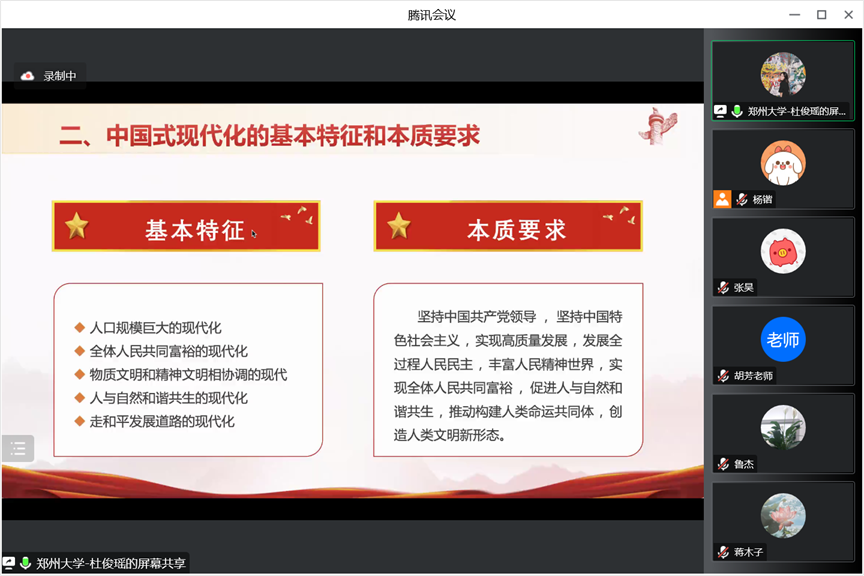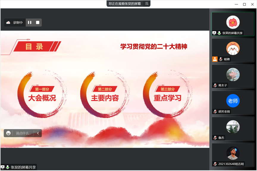 博士生杜俊瑶同学进行导读。内容共分为七个部分进行阐释分析。第一部分,杜俊瑶同学从党的二十大召开的时机、主题和总要求三方面介绍了党的二十大报告的结构。第二部分,分析了过去五年工作和新时代十年伟大变革的重大意义。第三部分,从当前面临的时代课题出发,强调必须坚持习近平新时代中国特色社会主义思想的世界观和方法论。第四部分,指出必须坚持五个重大原则,以中国式现代化推进中华民族伟大复兴。第五部分,从经济、文化、民生等方面介绍全面建设社会主义现代化国家的决策部署。第六部分,分析了以伟大自我革命引领伟大社会革命的重要要求。第七部分,提出了团结奋斗创造伟业的时代要求,强调青年要有理想、敢担当、能吃苦、肯奋斗,让青春在全面建设社会主义现代化国家的火热实践中绽放绚丽之花。