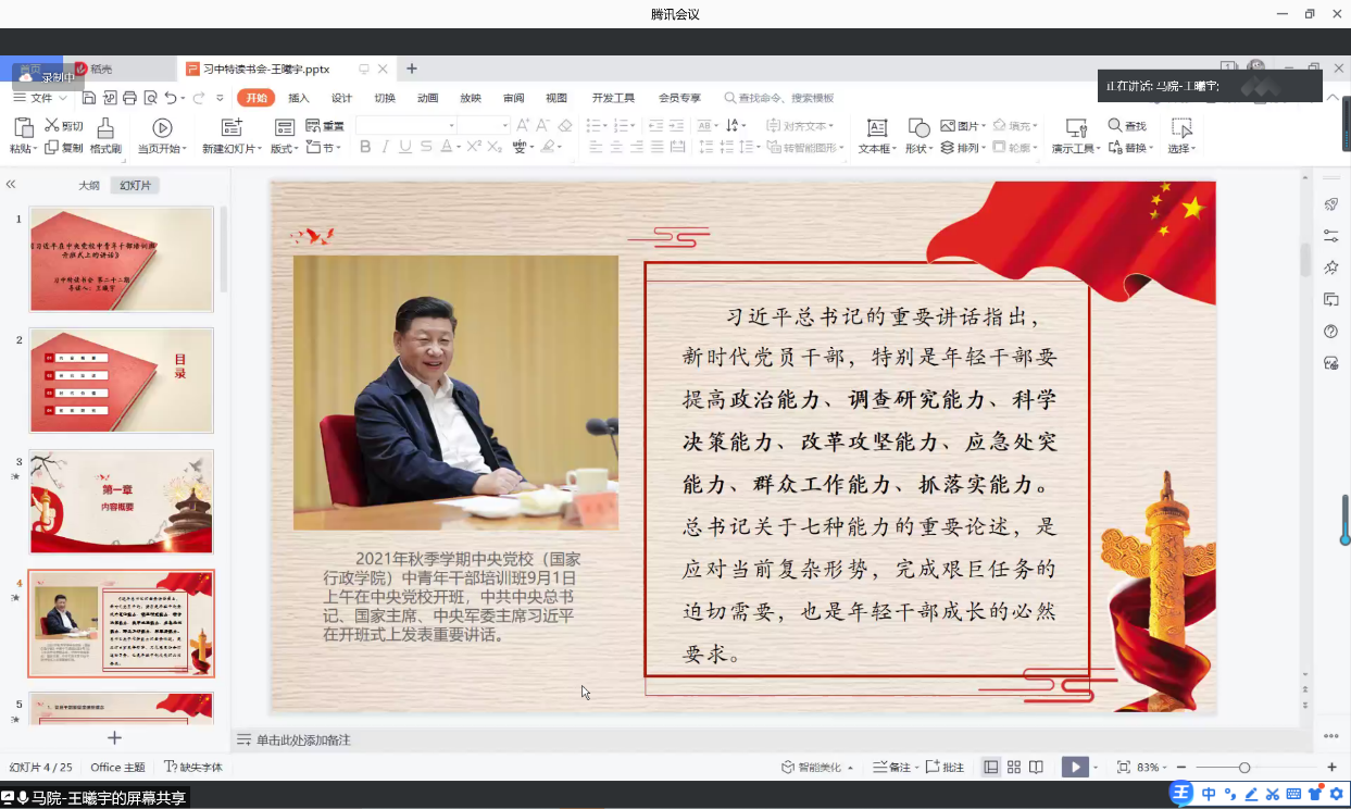 硕士生王曦宇同学。她从四个方面展开:第一,内容概要。习近平总书记的重要讲话指出新时代党员干部要提高的七种能力,并提出了新时代对党员干部的四大要求,一是党员干部要坚定理想信念,这个理想信念就是马克思主义信仰、共产主义远大理想、中国特色社会主义共同理想;二是一切从实际出发,这一要求是我们想问题、做决策、办事情的出发点和落脚点;三是党员干部要敢于担当,干事担事,是干部的职责所在,也是价值所在;四是党员干部要坚持原则,坚持原则是共产党人的重要品格,是衡量一个干部是否称职的重要标准。其次,针对每个部分,阐述了具体内容,让大家进一步理解讲话的主要内容和扩展意义。第二,研究综述。分别围绕两大层面进行了研究综述。第一层面,围绕讲话重大意义和精神实质展开热议;第二层面,围绕讲话内容展开研究综述,相继从习近平坚定理想信念、习近平强化政治意识理念两个方面论述。第三,时代价值。深入理解和把握讲话内容后,可以从四个方面入手探讨时代价值。一是坚定理想信念,把坚定理想信念与对党忠诚联系起来;二是坚持一切从实际出发,党员干部要脚踏实地,以事实为依据;三是坚定政治意识,加强理论知识的学习,学习与本职工作相关的新知识新技能,不断完善履职尽责必备的知识体系;四是要敢于担当,以实践出真知,提高党性修养,砥砺政治品格,锤炼过硬本领,以忠诚干净担当的实际行动,在全面建设社会主义现代化国家新征程中奋勇争先、建功立业。最后,研究拓展。在新时期,如何更好的落实习近平同志对于中青年党员干部提出的几点要求?有待同学们进行思考。