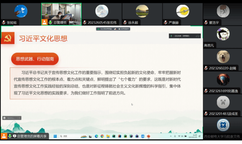 博士生张文培同学进行导读。她将导读内容分为四部分进行讲解。首先,她介绍了《习近平对宣传思想文化工作作出的重要指示》的主要内容与创新提法,着重解读“七个着力”和“十四个强调”相关的文本内容,并结合习近平文化思想的形成过程,习近平文化思想是实践总结、理论结晶,是明体达用、体用贯通,是思想武器、行动指南。其次,介绍了习近平文化思想的理论渊源与实践基础,认为习近平文化思想继承发展了马克思主义文化理论,充分汲取中华优秀传统文化精华,总结提炼党的文化建设理论成果,借鉴吸收人类优秀文化成果,着眼新时代中国特色社会主义文化强国建设面临的新形势新挑战,紧扣新时代中国特色社会主义文化强国建设的新任务新要求,引领新时代中国特色社会主义文化强国建设实现新发展、取得新跨越。同时结合令小雄、袁健、付文军、岑朝阳、陈金龙、蔡馥等专家学者的观点对《指示》的内容进行解读。最后,她提出关于习近平文化思想与中国式现代化道路的文化选择的新思考,着重从习近平文化思想的价值逻辑及对中国式现代化的价值指引进行介绍,阐述了在习近平文化思想指导下中国式现代化道路的中华优秀传统文化、革命文化、社会主义先进文化的历史生成。