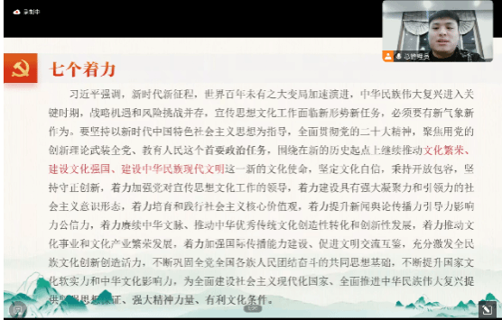然后,卢黎歌教授对赵欣同学进行了点评。卢老师认为赵欣同学的导读内容具有一定的深度,系统地梳理了习近平文化思想,同时结合其他学者的观点,分享了自己对习近平文化思想的观点与感悟,但也存在一些问题。首先,习近平文化思想是博大精深的体系,内容是非常丰富的,需要对习近平文化思想的内涵进行全面深入的分析。其次,要从“两个结合”角度加大对党的宣传思想文化工作的规律性的认识。再次,要学会用系统的眼光去看待习近平文化思想,加深理解。此外,我们需要对新闻舆论“四力”中的公信力加以深入研究,但导读内容对其关系分析较少。最后,我们应避免过度引用,要提出自己的观点与想法。