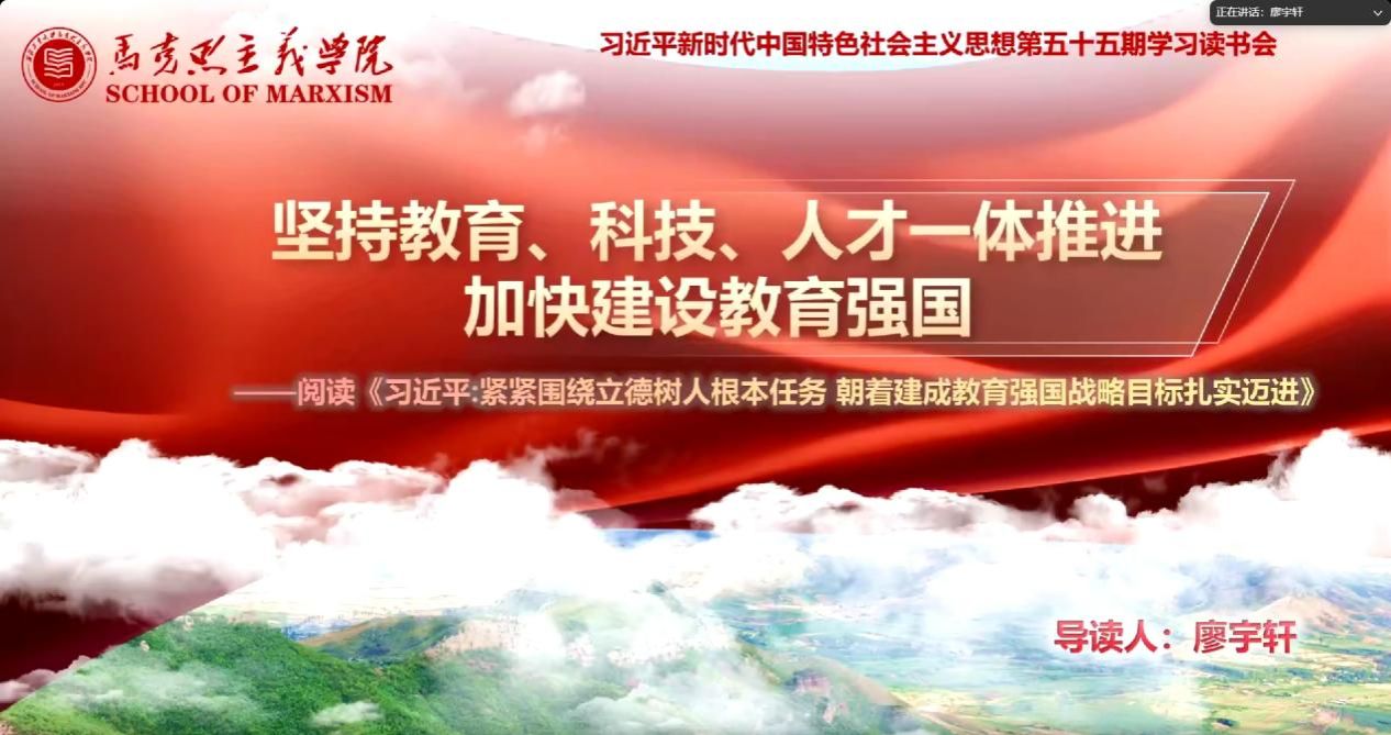 硕士生廖宇轩同学作为首位导读人,在认真学习研读《习近平:紧紧围绕立德树人根本任务 朝着建成教育强国战略目标扎实迈进》文本内容的基础上,以坚持教育、科技、人才一体推进加快建设教育强国为主题进行分享。首先,他通过对习近平总书记关于教育论述的梳理,全面系统阐释了为什么要坚持教育、科技、人才一体推进;其次,他结合西北工业大学总师育人文化,展开分析了怎么落实立德树人根本任务;之后,他运用知网可视化分析对教育强国相关论文与选题进行了分析,还为我们提供了教育强国相关学术研讨会的一些信息,既为同学们提供了宝贵的学术视角,也使同学们能够更深入地了解当前的热点方向。