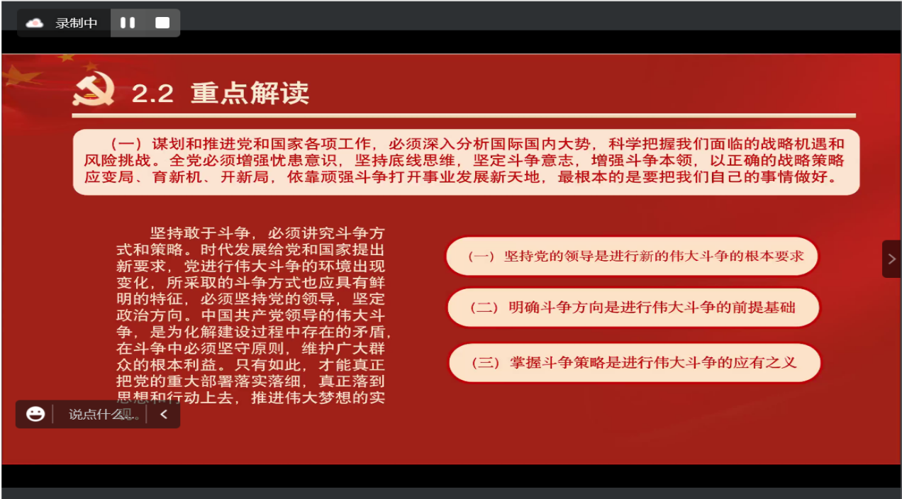 为迎接党的二十大胜利召开,推进习近平新时代中国特色社会主义思想进教材、进课堂、进头脑。2022年9月24日,电玩城游戏开放的电子游艺场所,亦称电子游戏机室 习近平新时代中国特色社会主义思想学习读书会第三十一期活动主题围绕《习近平在省部级主要领导干部‘学习习近平总书记重要讲话精神,迎接党的二十大’专题研讨班上发表的重要讲话》进行学习研讨。本次读书会由电玩城游戏 思想政治教育系主任、博士生导师鲁杰教授发起,电玩城游戏 硕士生蒋木子主持,长安大学电玩城游戏 教授、副院长黄蜺作为对话教师应邀参加。