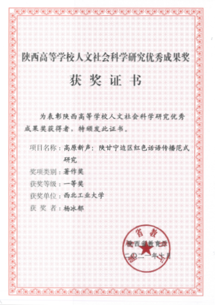 《高原新声:陕甘宁边区红色话语传播范式研究》一书入选 2019 年度教育部思想政治教育工作文库;荣获2021年度陕西高等电玩城游戏