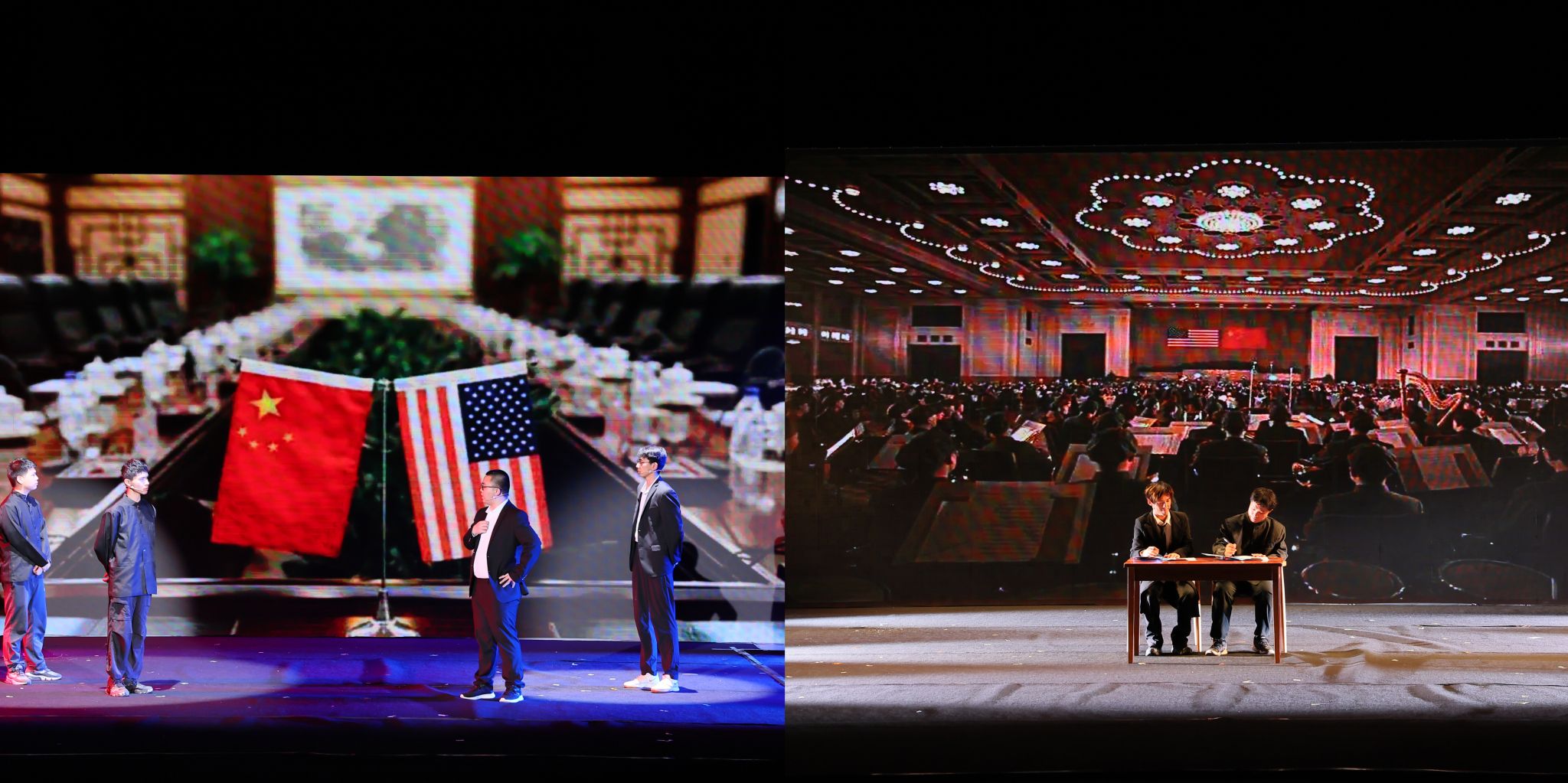 学生雷鹏涛参演《尼克松访华》:我出演的是第四篇章《尼克松访华》,我们的剧目还原了1972年美国总统尼克松访问中国的历史时刻。在表演中,我仿佛亲历了当时的场景和氛围,更深切体会中国外交峥嵘岁月中那种敢于斗争、善于斗争的斗争精神。