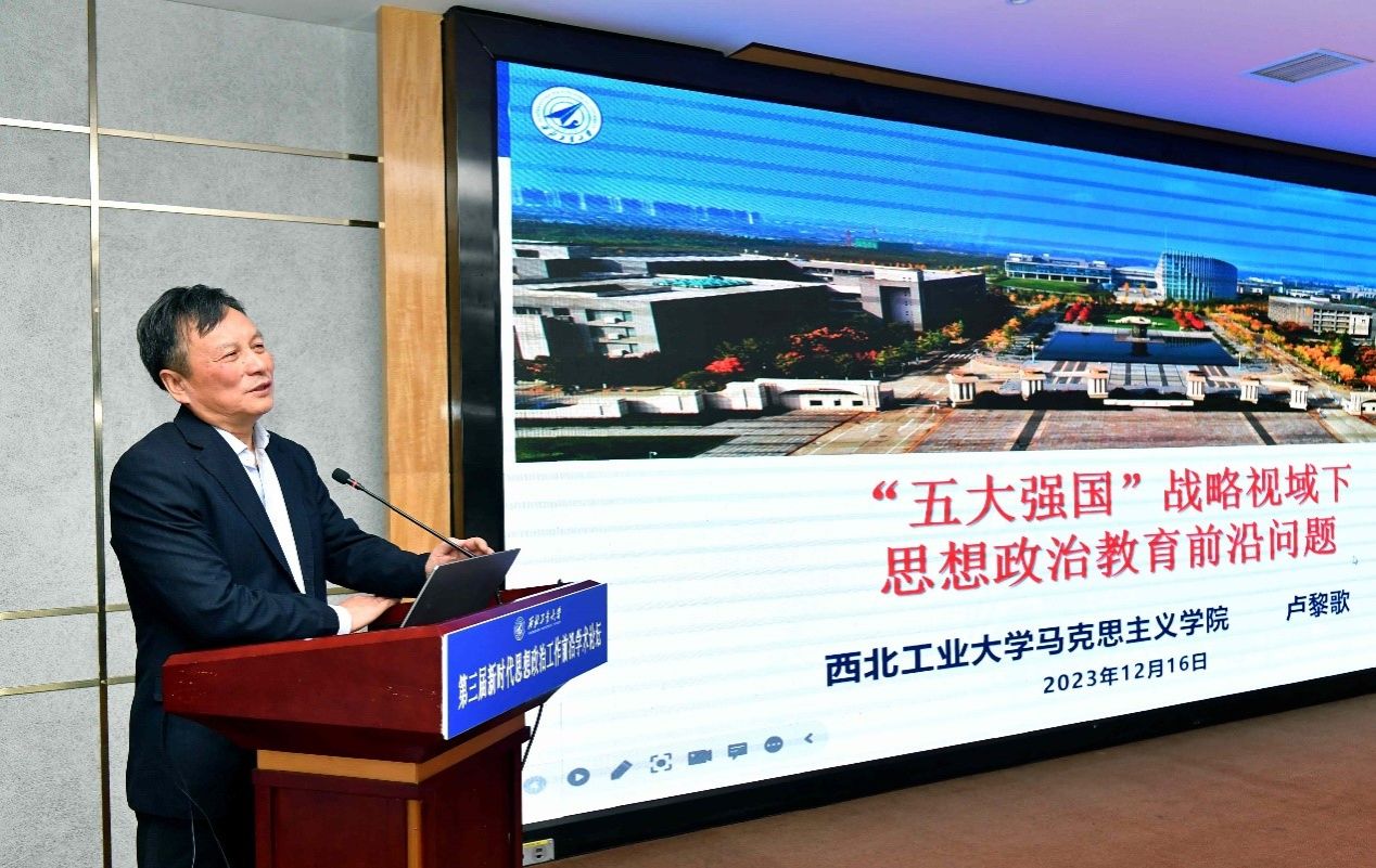 国家教学名师、教育部社科委马学部委员、全国高校思政研究分会常务理事、西北工业大学卢黎歌教授以“‘五大强国’战略视域下思想政治教育前沿问题”为主题,探讨了对“前沿”“思想政治教育前沿问题”的理解,从“五大强国”的提出分析了教育强国视域下、科技强国视域下、人才强国视域下、文化强国视域下以及体育强国视域下的思政前沿问题。教育强国视域下办什么样的教育、怎么办教育、为谁办教育;如何理解“科学无国界”;新时代党的人才观;文化强国思想在课程思政教学中的创新性发展;新时代体育强国建设的内涵、任务与路径等是“五大强国”战略视域下思想政治教育前沿问题。