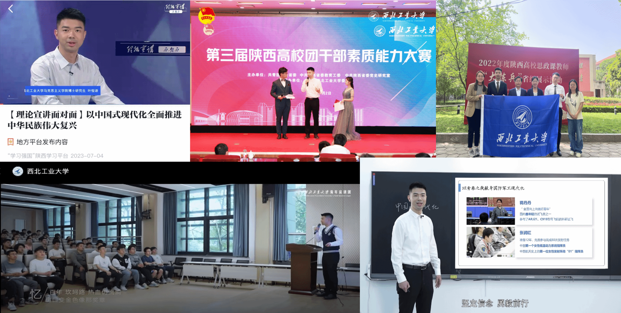 他坚持发挥马理论专业优势,主动走上大中小学课堂讲台,讲好党的创新理论成果。一方面,在“以赛促练”中提升理论宣讲过硬本领,参加多项省级教学展示、竞赛及培训,以全省第一名的成绩斩获第三届陕西高校团干部素质能力大赛一等奖,获评陕西高校思政课教师“大练兵”教学团队能手,担任校青年宣讲团讲师,为上百名在校生开展“推进中国式现代化的青年力量”主题宣讲,不断巩固壮大“总师育人文化”的主流思想舆论。另一方面,利用网络新媒体渠道拓展宣讲覆盖面,参加中共陕西省委宣传部推出的“理论宣讲面对面”栏目录制,受学习强国平台报道;在共青团陕西省委电玩城游戏 部指导下,参编《陕西中学团课讲义》并录制“社会主义核心价值观”主题团课;上镜录制陕西网五四青年节主题MV《青春的样子》、重庆日报《理响青年》栏目,以青年视角和大众语言传递正能量,发扬理论联系实际的优良作风和学术品格。
