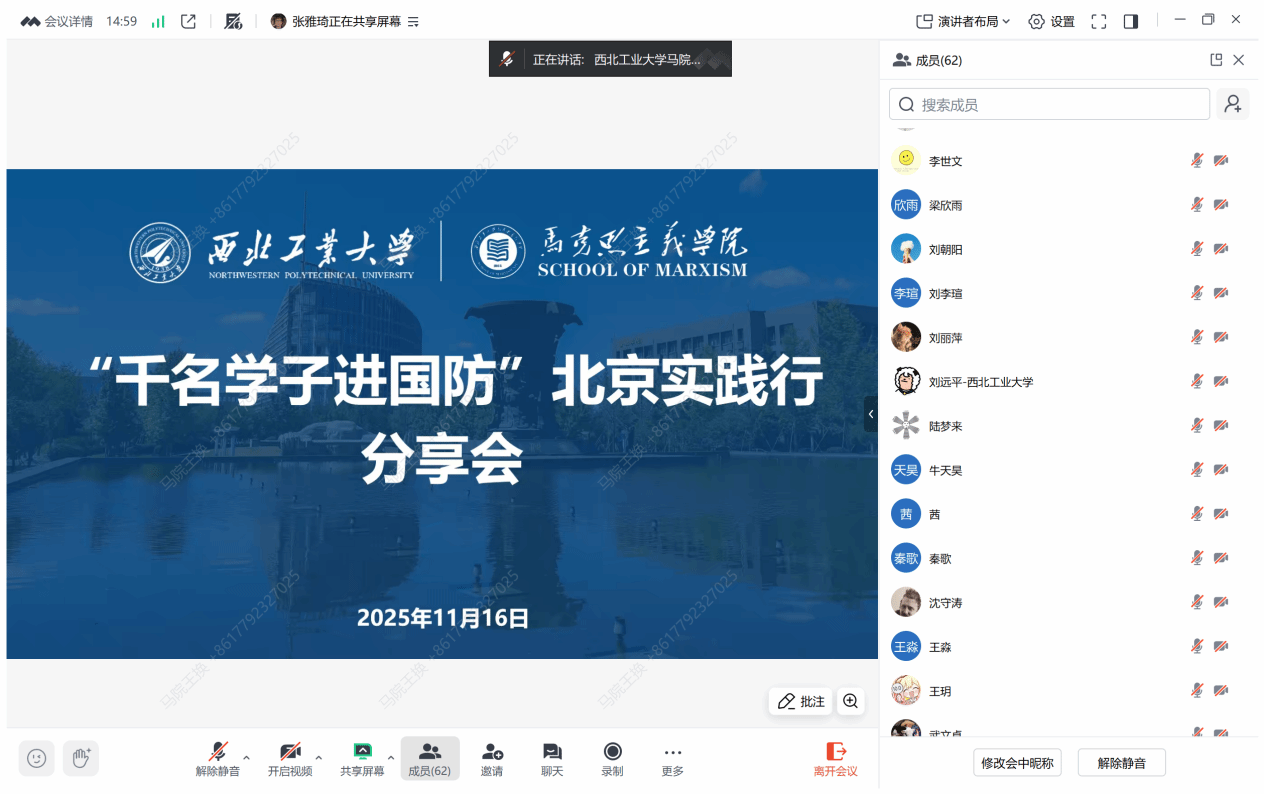 分享会上,六名参与“千名学子进国防”北京实践活动的学生代表,围绕就业选择、能力培养、学科价值等多个方面,分享了各自的访企实践感悟。2022级博士研究生李世文介绍了调研三家单位的基本情况,并结合与各单位人力资源负责人的座谈感受,鼓励同学们拓宽求职视野,打破专业局限,全面提升综合能力。2023级博士研究生沈守涛聚焦国企、央企就业方向,深入解读了行政岗位对复合型人才的需求,鼓励马克思主义理论专业学生树立专业自信,多元拓展就业路径。2023级硕士研究生褚星波阐述了马克思主义理论学科的思维优势,强调扎实的思维能力和坚韧的意志品质是职业发展的重要支撑。2023级硕士研究生刘丽萍结合实践经历,建议同学们积极参与多元活动,提升综合素养,拓宽就业视野,同时精准优化简历,增强求职竞争力。2025级本科生陆梦来分享了专业认知的转变过程,生动展现了文科研究的实践价值,并呼吁新时代青年积极承担网络安全责任。2025级本科生谢建年则强调了细节管理与核心就业能力的重要性,鼓励大家勇于尝试、敢于试错,主动转变学生思维,迅速适应职场环境。