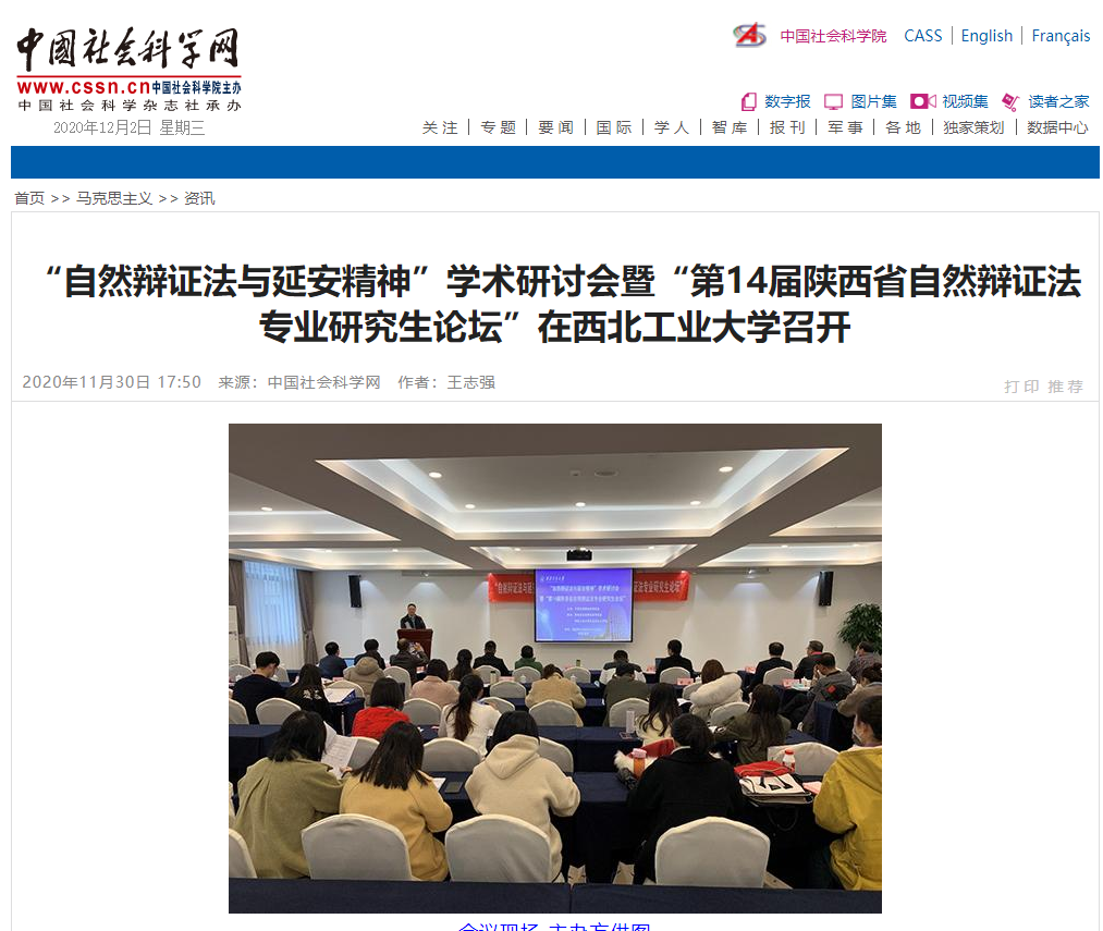 2020年11月30日,中国社会科学网报道电玩城游戏 “自然辩证法与延安精神”学术研讨会暨“第14届陕西省自然辩证法专业研究生论坛”召开情况。