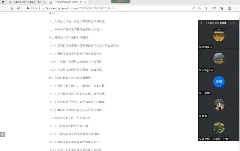 思想政治教育系于8月15日晚,在线召开集体备课会。各位老师结合会前对周末理论大讲堂等专家报告的自主学习、《台湾问题与新时代中国统一事业》白皮书的认真学习,通过轮流发言、相互交流、共同探讨的方式,对全体教师暑期备课进度及理论学习情况进行了交流与探讨。院长杨云霞、系主任鲁杰及承担思想政治教育课教学工作的全体教师参加了此次备课会。学习过程中,老师们普遍认为,白皮书的发表振奋人心,及时、充分地体现了中央对解决台湾问题、推进实现祖国统一事业的信心和决心,同时也体现了中央愿意以最大诚意、尽最大努力争取和平统一的意志。国家的统一是我们中华民族走向伟大复兴的历史必然,台湾是中国的一部分,同时祖国完全统一的进程也不可阻挡。作为一名思政课教师,我们要引导学生学习和掌握台湾问题的历史,树立实现国家统一的历史使命感和责任感,激发学生为祖国统一和实现中华民族伟大复兴而奋斗的信心和动力。