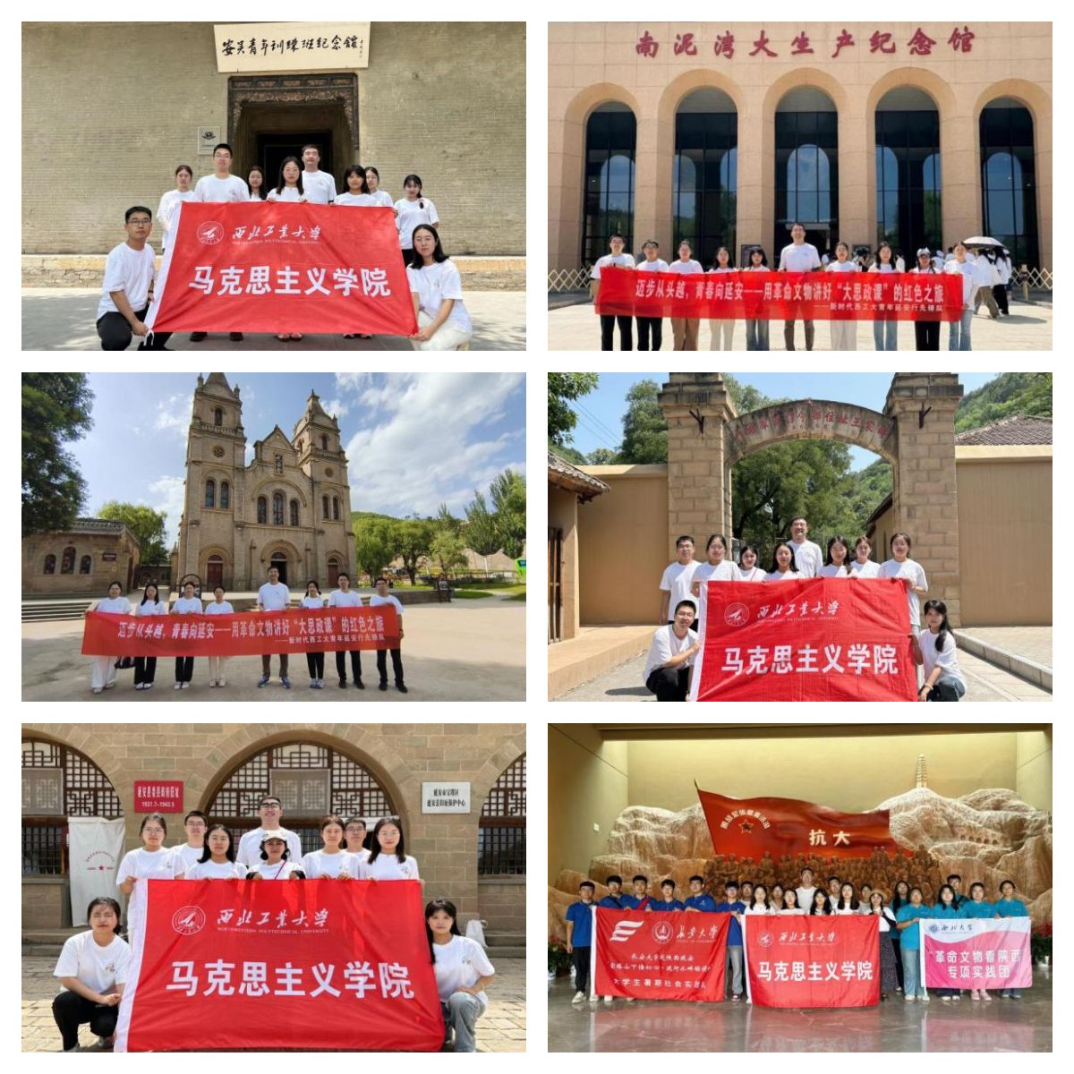 在八路军西安办事处纪念馆,张小雅老师为大家带来《抗战时期国际友人国际友人 如何讲好中国故事》专题思政课,讲述国际友人眼中的延安岁月及其感人故事,为新时代讲好中国故事提供了启发和参考。在甘泉县,为纪念中国人民抗日战争暨世界反法西斯战争胜利80周年,实践队利用休息时间,在团队负责人韩瑞欣的带领下,认真学习了习近平在纪念中国人民抗日战争暨世界反法西斯战争胜利70周年大会上的讲话,深刻领悟抗战精神中的爱国情怀、民族气节、英雄气概和必胜信念,更加筑牢了实践队员理想信念。在枣园革命旧址,实践队员赵婧雯、李悦、霍雨薇、梁晓涵围绕《为人民服务过时了吗?》开讲,共同探讨新时代青年党员如何更好地践行为人民服务宗旨。在延安革命纪念馆,实践队认真聆听《“诗言志”——小炕桌上书写千年绝唱》《站在最大多数劳动人民的一面》和《没有共产党就没有新中国》等思政课,从革命文物中深刻领悟中国共产党人为民族独立和人民解放不懈奋斗的初心与使命,更加坚定了为实现中华民族伟大复兴而团结奋斗的信念和决心。在杨家岭革命旧址,纪念馆老师带来了《中国的希望在延安》专题思政课,围绕抗战时期陈嘉庚访问延安的故事,讲述了“一顿饭背后的作风对决”,得出了“中国的希望在延安”的历史结论。在桥儿沟旧址,实践队聆听当地小学生志愿者带来的精彩分享。在宝塔山上,实践队员刘书文、王柯楠、杨振吉、王海博围绕《宝塔山下的誓言》开讲,用铿锵有力的话语,发出“请党放心,强国有我”的西工大青年誓言。岁月无言,丰碑永铸。实践队通过在不同革命旧址学习和开展多样的思政课,让革命文物“说话”,提高了运用革命文物讲思政课的本领,在学思践悟中坚定理想信念。