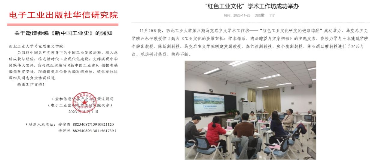 。团队成立后,受邀参与完成了工业和信息化部政策和法规司委托项目《新中国工业史》的编撰;获批了西北工业大学“双一流学科建设”项目“研究生高水平教材”系列之“中国工业精神谱系”课题;开展工业文化研究工作坊;指导研究生撰写毕业论文“中国式现代化视野里中国工匠精神的演进历程:以劳动模范为切入点”和“十七年工业歌谣的文化精神建构研究”。